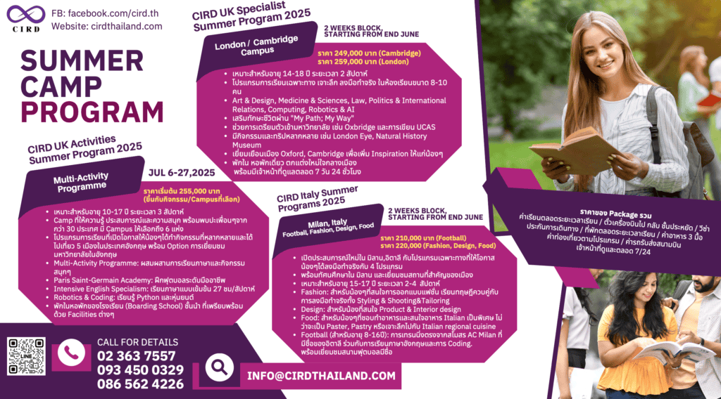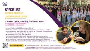 คอร์สพิเศษที่เราออกแบบให้ มีความรู้รอบด้านอย่างครบถ้วน ทั้งการเรียนภาษาอังกฤษอย่างเข้มข้นกับเจ้าของภาษาที่ผ่านการรับรองคุณภาพการสอนจากสถาบันนอกจากนั้นยังได้สนุกไปกับกิจกรรมหลากหลาย มีทั้งกิจกรรม กีฬา ศิลปะ และการศึกษาวัฒนธรรม ซึ่งผู้เรียนจะได้พัฒนาทักษะทางภาษา การเข้าสังคม และมีเพื่อนที่หลากหลายผ่านการเรียนและทำกิจกรรมอย่างสนุกสนานตลอดการศึกษา